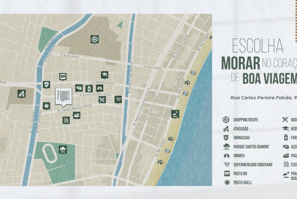 O Flow Boa Viagem fica a poucos passos do Shopping Recife e próximo à orla de Boa Viagem. Além disso, você encontra supermercados, farmácias, padarias e diversos serviços essenciais no entorno imediato.