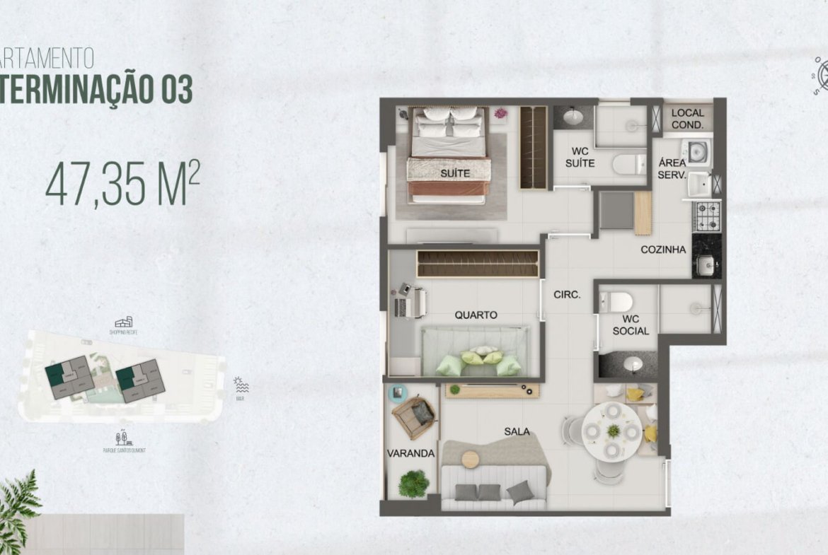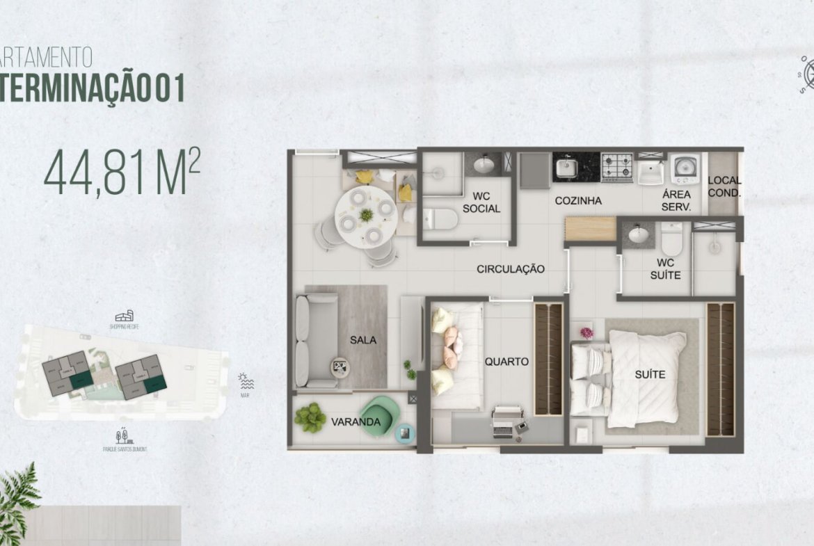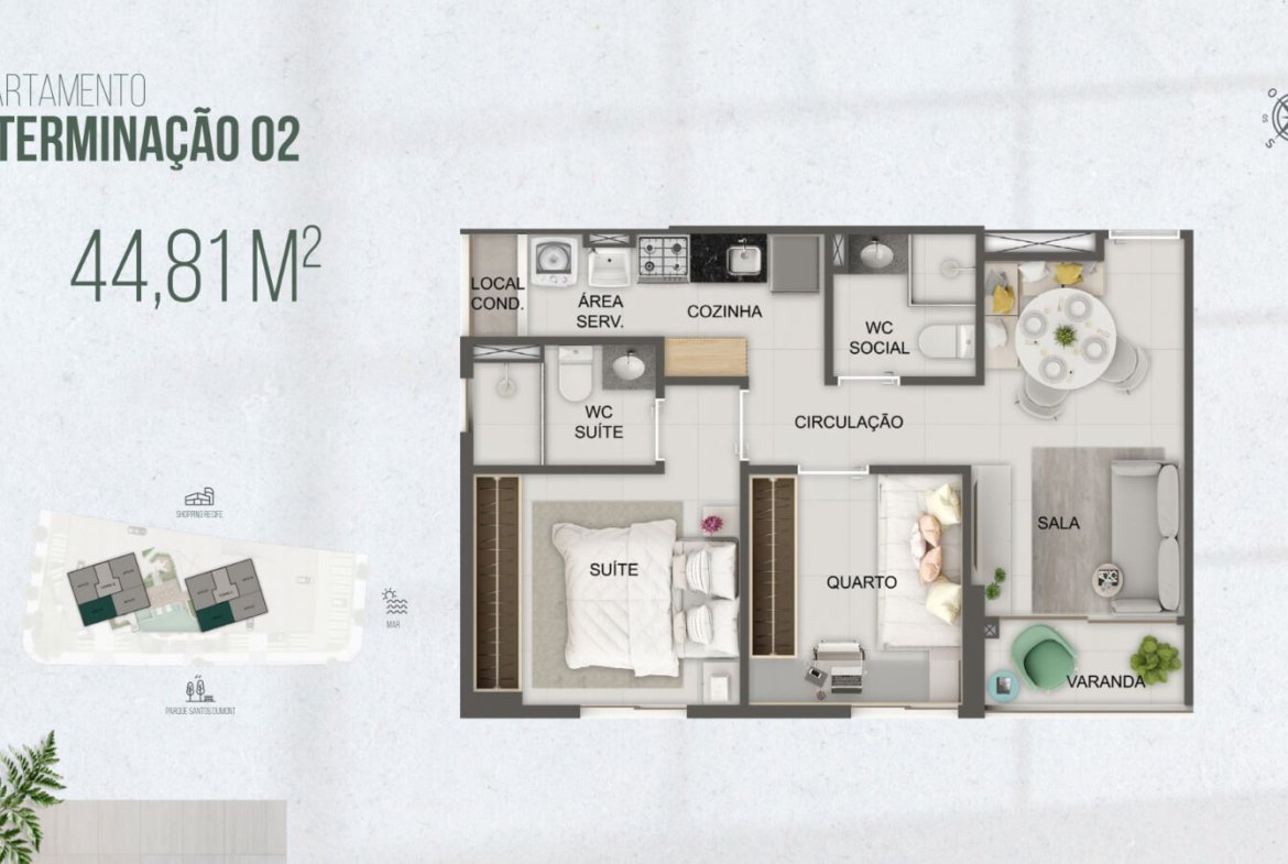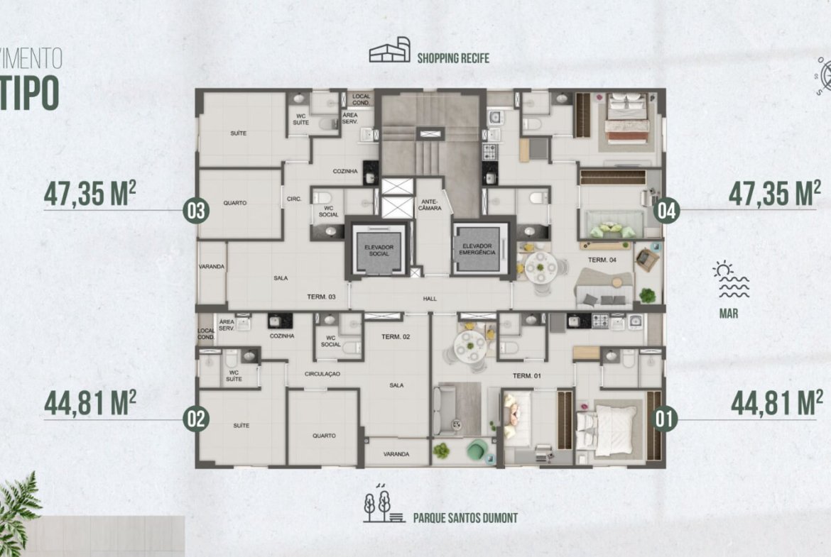 As unidades possuem 2 quartos e metragens de 44,81m² e 47,35m². Dessa forma, o projeto atende quem busca funcionalidade sem abrir mão do conforto. Além disso, a planta valoriza a integração dos ambientes e otimiza cada metro quadrado.