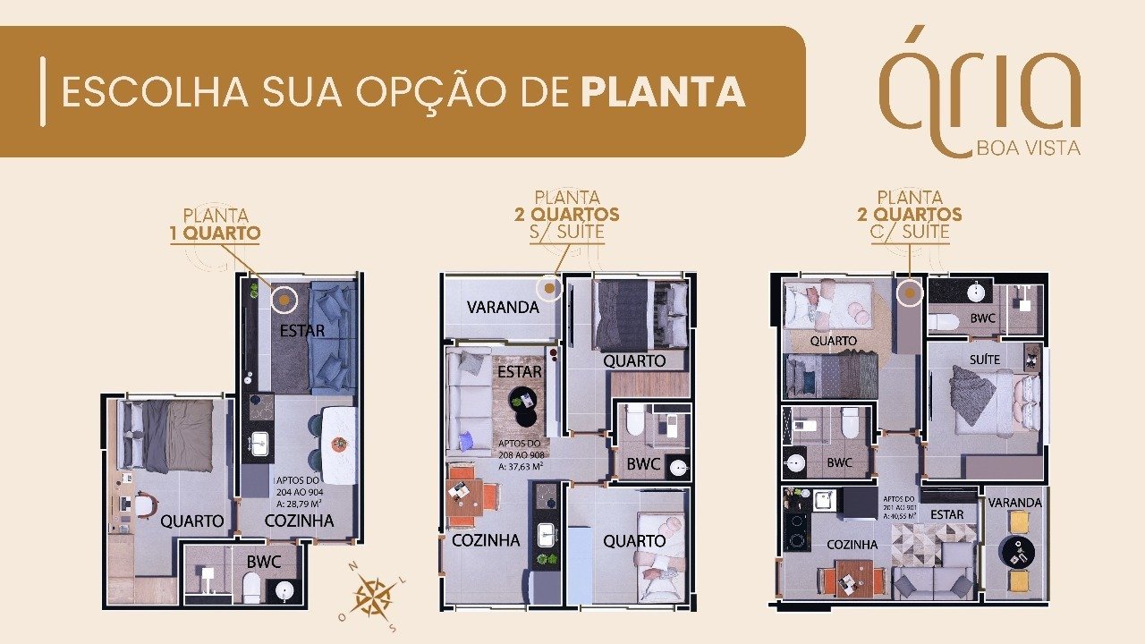 Viva no centro de tudo com o Apartamento a Venda na Boa Vista Aria. O empreendimento possui 2 blocos e 182 unidades, com plantas inteligentes de 1 quarto (27 a 28,7m²) e 2 quartos, com opções de varanda e suíte (37 a 41,8m²). Todas as unidades contam com sala integrada à cozinha, fechadura eletrônica e acabamento em porcelanato já instalado, garantindo praticidade e elegância desde o primeiro dia.