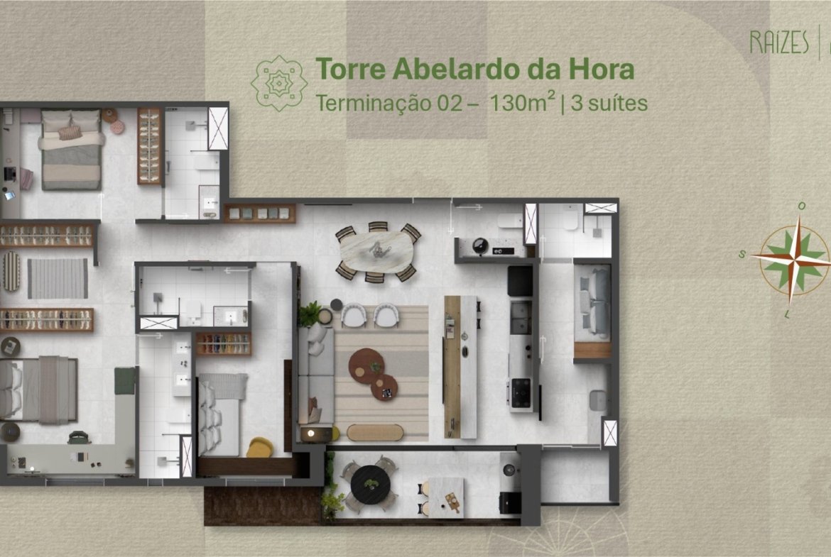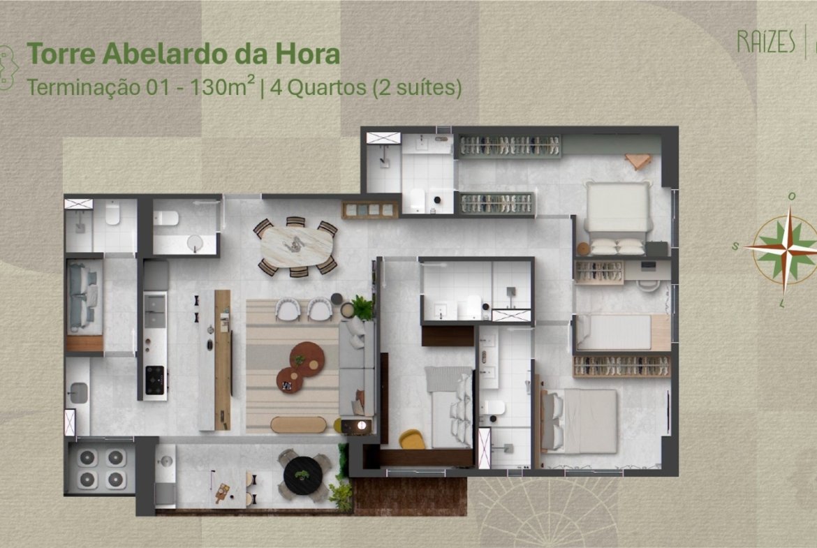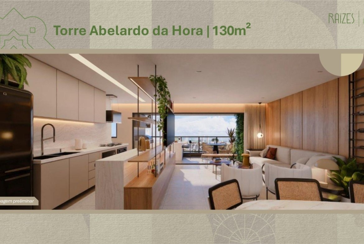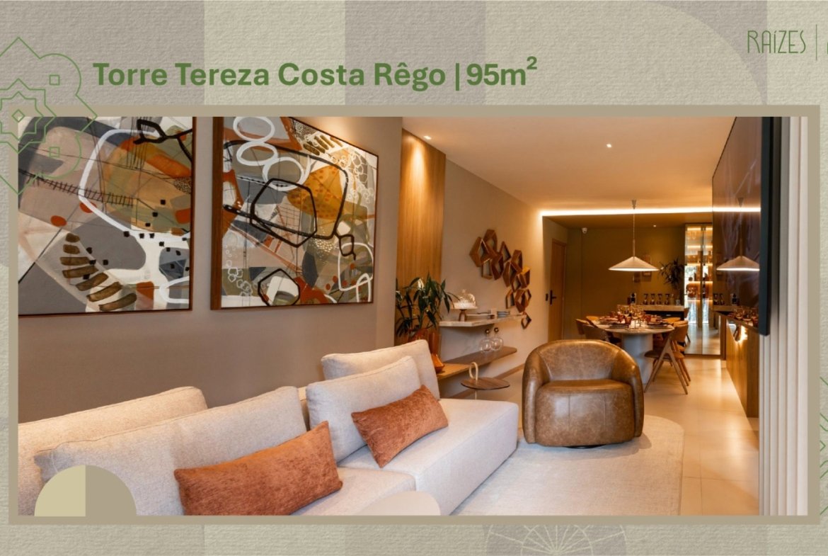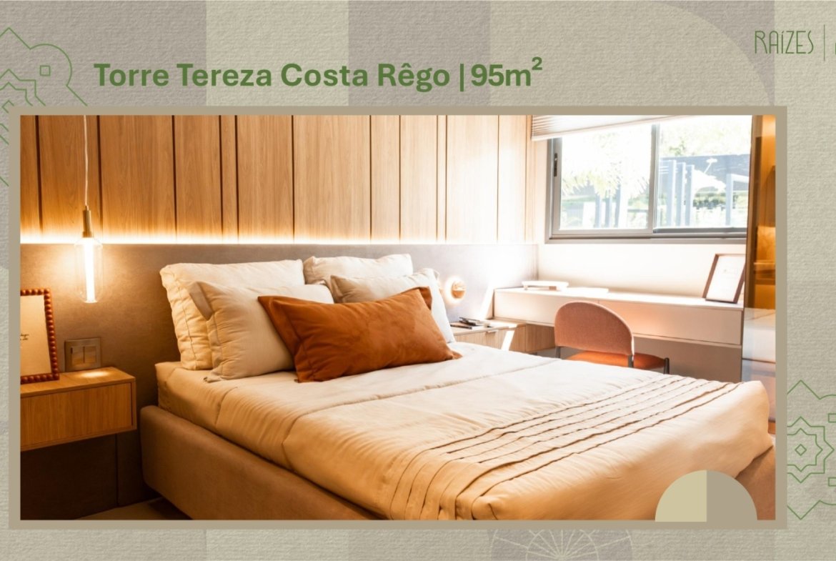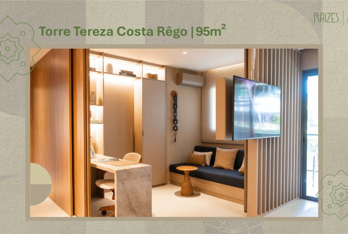 O Raízes agora se expande com duas torres exclusivas, batizadas em homenagem a grandes nomes da arte pernambucana. Primeiramente, temos a Torre Tereza Costa Rêgo (95m²), que possui a mesma planta do aclamado apartamento decorado. Além disso, o projeto conta com a Torre Abelardo da Hora (130m²). Esta última oferece flexibilidade total, pois você decide, no momento da compra, se deseja uma planta com 3 ou 4 quartos.