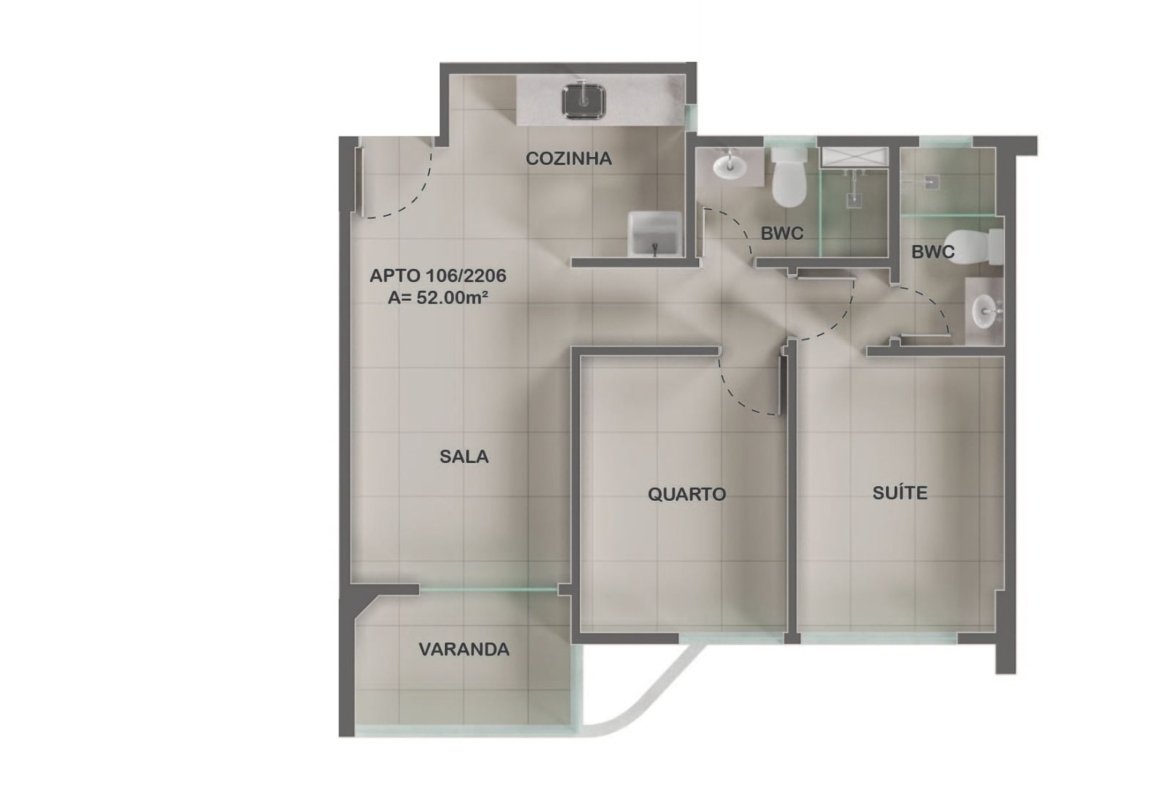 Terminação 01 e 06 (52 m²): Possui varanda, sala para dois ambientes (estar/jantar), 02 quartos (sendo 01 suíte), banheiro social, cozinha e área de serviço.