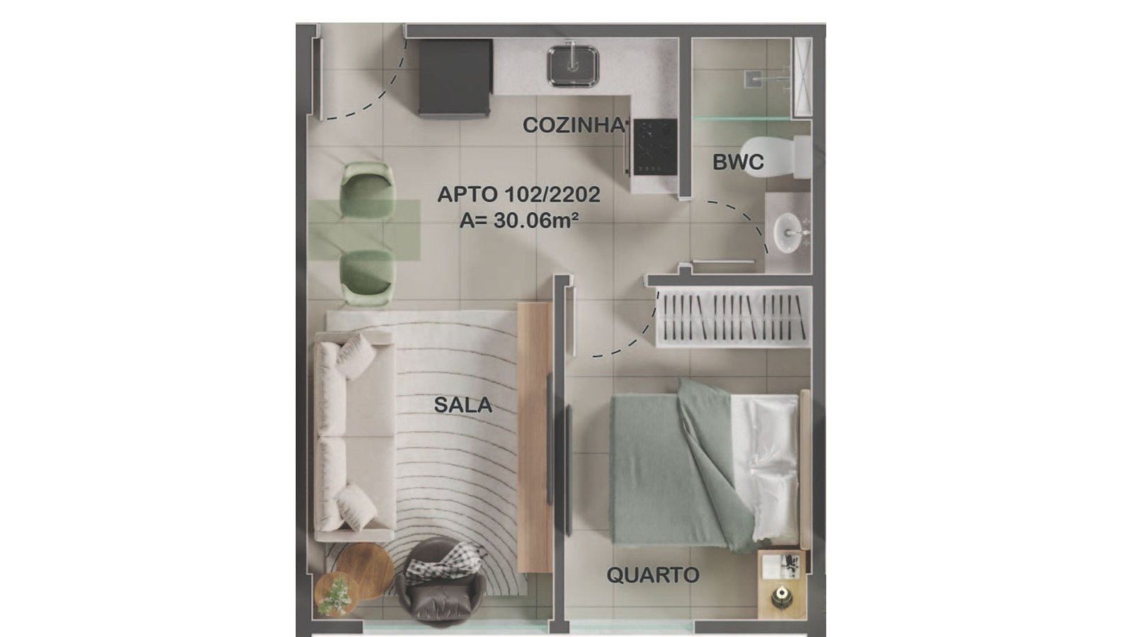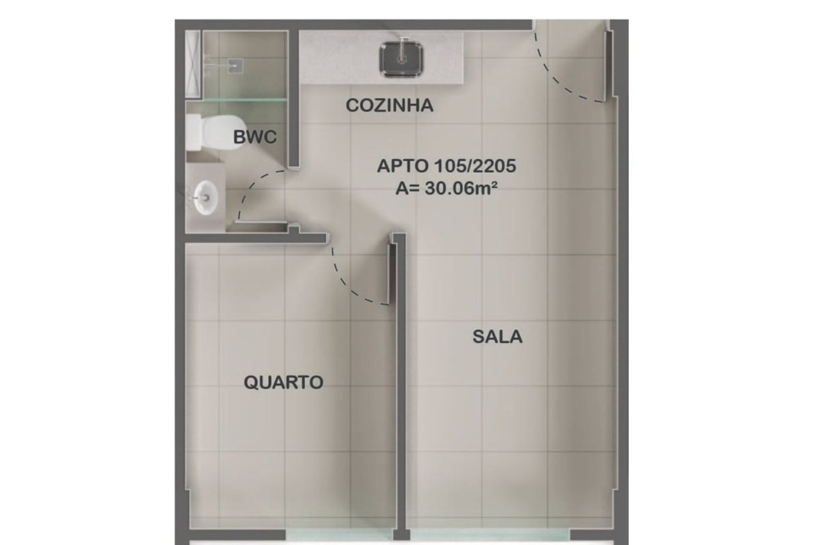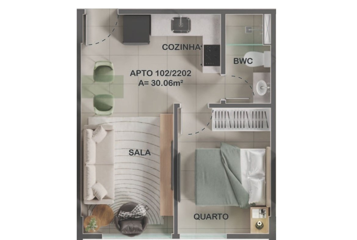 Terminação 02 e 05 (30,06 m²): Apresenta sala, 01 quarto privativo, banheiro e cozinha funcional.