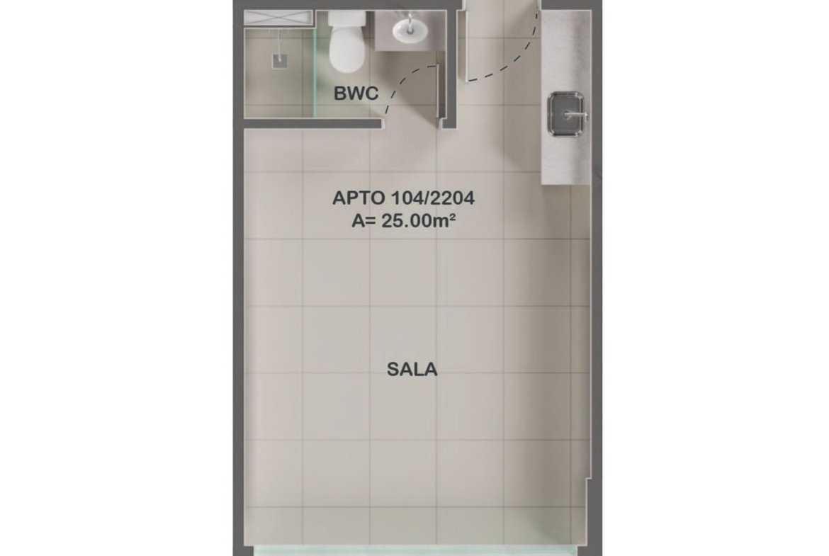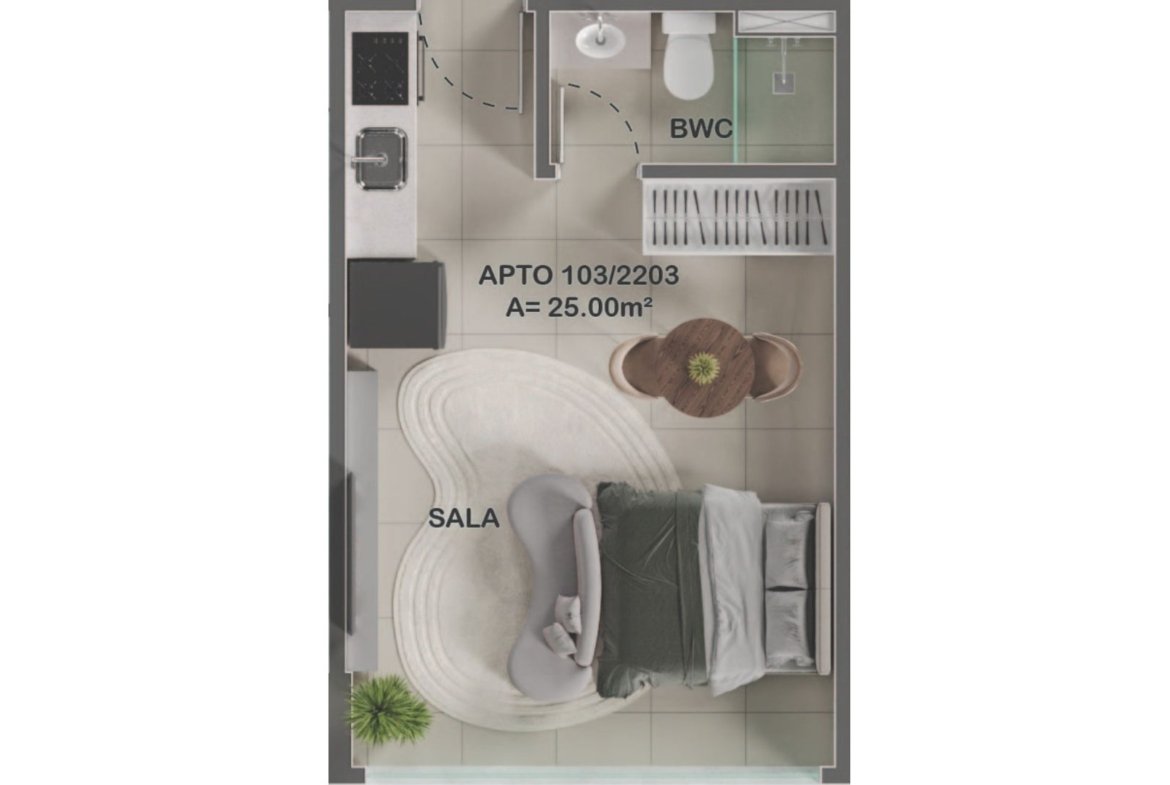 Terminação 03 e 04 (25 m²): Oferece o conceito Studio, com um ambiente totalmente integrado, banheiro e cozinha, ideal para rentabilidade via locação.