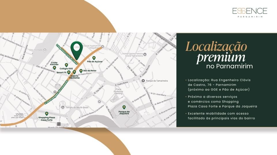 Situado na Rua Engenheiro Clóvis de Castro, 76, o Essence Parnamirim coloca você próximo a tudo que importa. Por exemplo, você estará a poucos passos do Colégio GGE, do Pão de Açúcar, e de centros comerciais como o Shopping Plaza Casa Forte. Além disso, o fácil acesso às principais vias do bairro e a proximidade com o Parque da Jaqueira garantem uma mobilidade excelente.