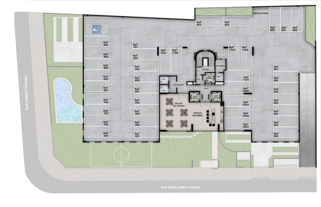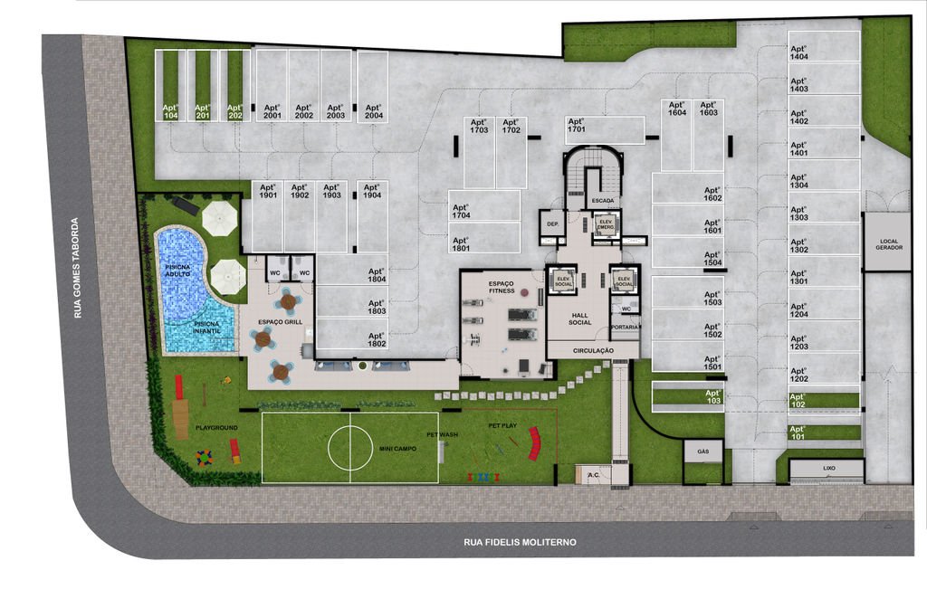 Dispõe de ampla área de lazer com Salão de Festas, Espaço Gourmet, Piscina Adulto/Infantil, Espaço Grill, Playground, Mini Campo, Pet Play e Pet Wash. Espaço Fitness, Bicicletário, Box Delivery, Wc masculino e feminino para PNE.
