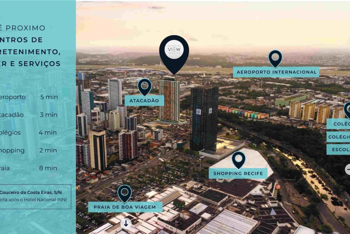Um empreendimento compacto e Inovador, excelente opção para investidores, o Edifício Shopping View, tem prazo de entrega para 2027, bem localizado a 2 minutos do Shopping Recife, 8 minutos da beira mar de Boa Viagem, 5 minutos do Aeroporto, 4 minutos de colégios e lotéricas, 3 minutos do Atacadão e supermercados, bancos e todos os serviços para atender a família.
