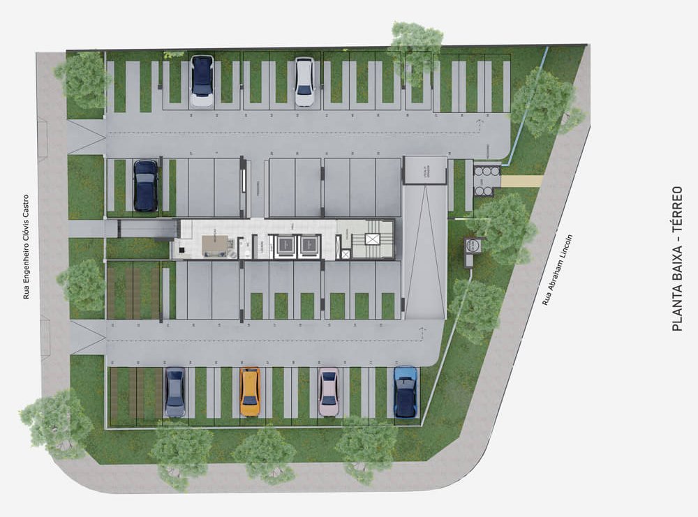 O empreendimento está distribuído em Pavimento Térreo, Pavimento Vazado 01, Pavimento Vazado 02. 9 Pavimentos Tipo com 6 Apartamentos por Andar, com um total de 60 Apartamentos e Vagas de Garagem Rotativas.