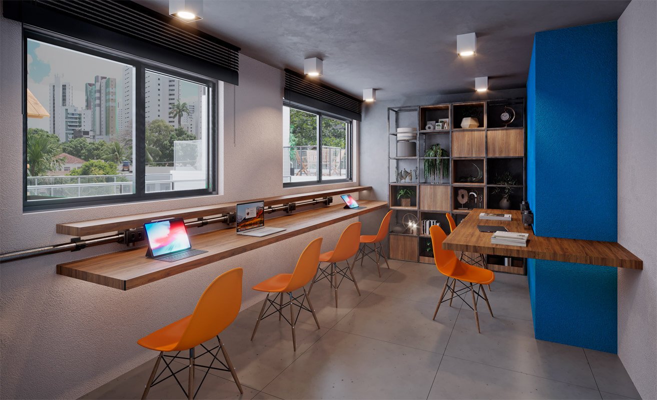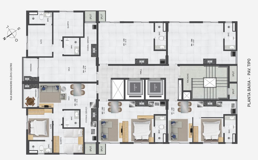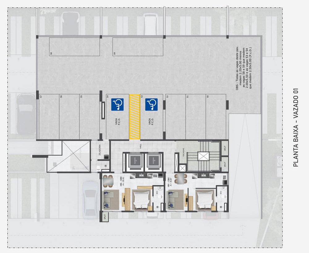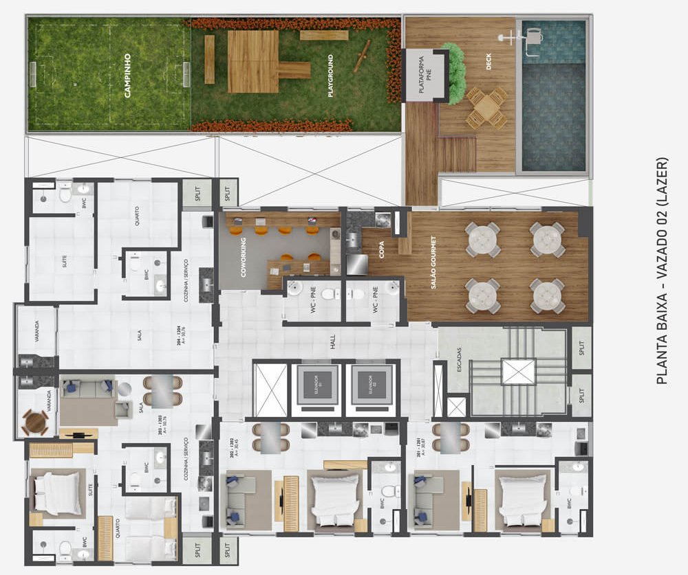 Além disso, no 2° Vazado, teremos 2 Apartamentos com 2 Quartos e 2 apartamentos Studio. Piscina Adulto/Infantil, Deck, Playground, Espaço Gourmet, Coworking, Campinho, Wcs Masculino e Feminino, Jardins.